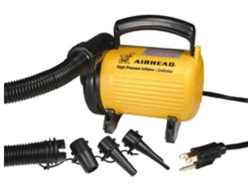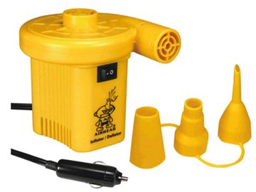 High-volume 12-volt portable air pump inflates and deflates towable, boats, pools, mattresses, and beach toys quickly and effectively.